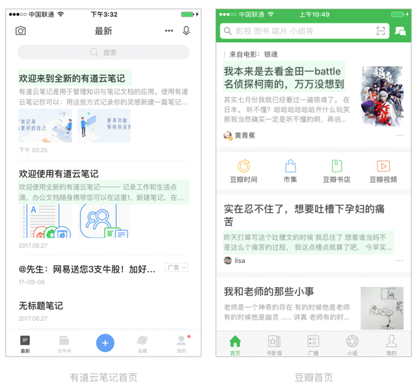 線上很多的APP設計標準大多的字體大小是雙數,而不同大小的字體相差幾乎都是4的倍數,比如下面的有道云筆記的標題為34px而內容的標題是26px。還有豆瓣的標題為38px而內容的字體大小是26px。除了這些以外,越小的字越不重要,比如時間,比如來源與閱讀量等等。